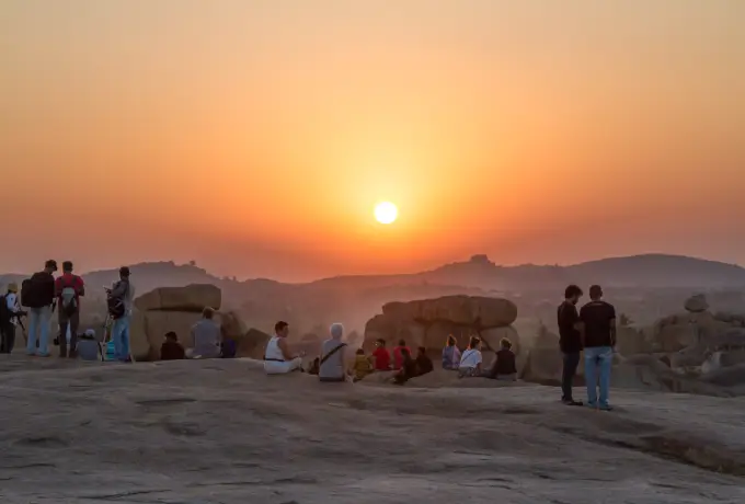 ハンピ最高の静穏・絶景日没スポットで、ヴィルパークシャ寺院近くに古代小寺院と象徴的巨石景観。夕陽時、金色に輝く遺跡・丘陵・トゥンガバドラ川の息を呑むパノラマ。落ち着いた雰囲気と少人数で、リラクゼーション・写真撮影に最適