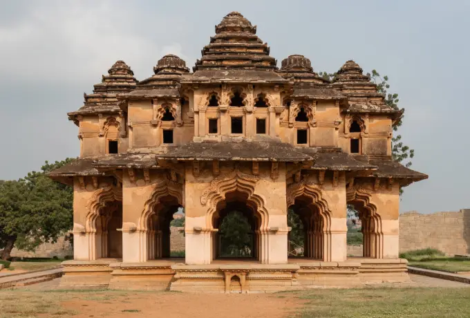 ロータス・マハル(蓮宮殿):ハンピ王宮区画の優美な蓮花デザイン建築。ヴィジャヤナガラ期建立、ヒンドゥーとイスラム様式の融合(アーチ、ドーム、対称レイアウト)が特徴。王妃の休息パビリオンとして使用か。