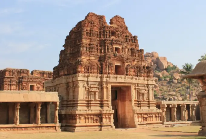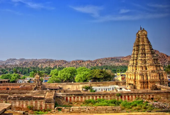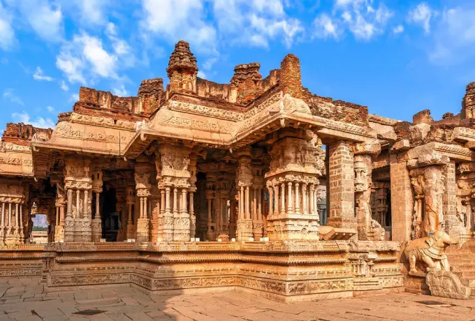 ハンピ最有名・建築的に壮大な寺院で、ヴィシュヌ神のヴィッタラ形を祀る。ヴィジャヤナガラ帝国期(15-16世紀)建立、ユネスコ世界遺産のハイライト。象徴的石戦車と軽く叩くと音の出る伝説的音楽柱で知られる。