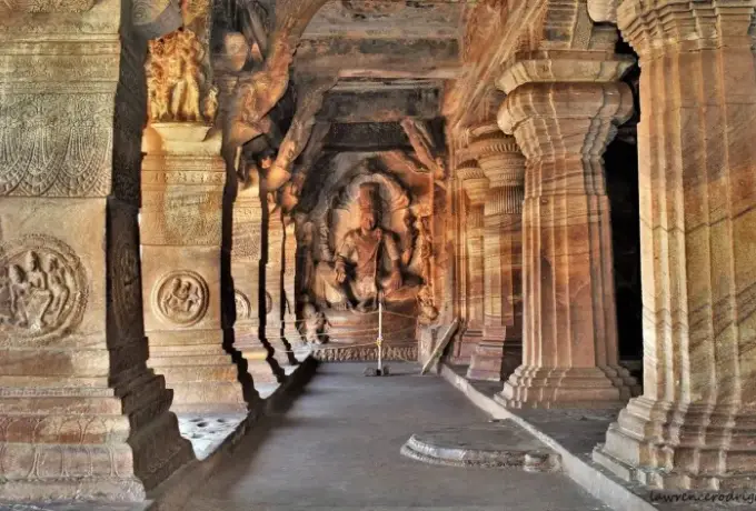 チャールキヤ朝(6-7世紀)の赤サンドストーン崖に刻まれた岩窟寺院群4つ。洞1:シヴァ神、洞2&3:ヴィシュヌ神、洞4:ジャイナ教ティールタンカラ。最精緻彫刻・彫像・柱で初期インド岩窟建築の傑作。アガスティヤ湖を望み歴史・景観両立