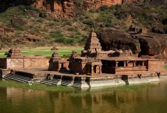 バダミのアガスティヤ湖畔に位置する美しいシヴァ神供養寺院群、劇的な赤サンドストーン断崖に囲まれる。夕陽時の静湖面に映る遺構・崖の絶景で有名、魔法のような雰囲気。チャールキヤ期(7-8世紀)建立、自然と調和した簡素優美建築。
